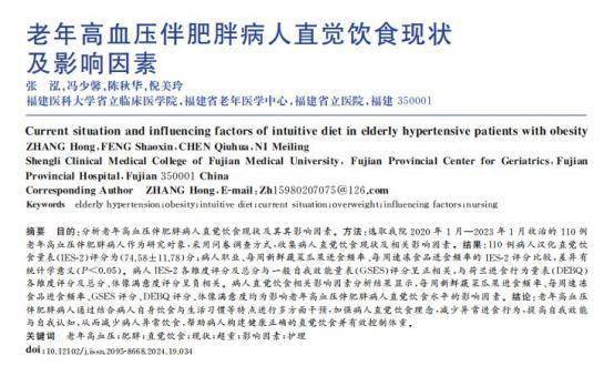 [1]张泓.老年高血压伴肥胖病人直觉饮食现状及影响因素,循证护理,2024-10-09