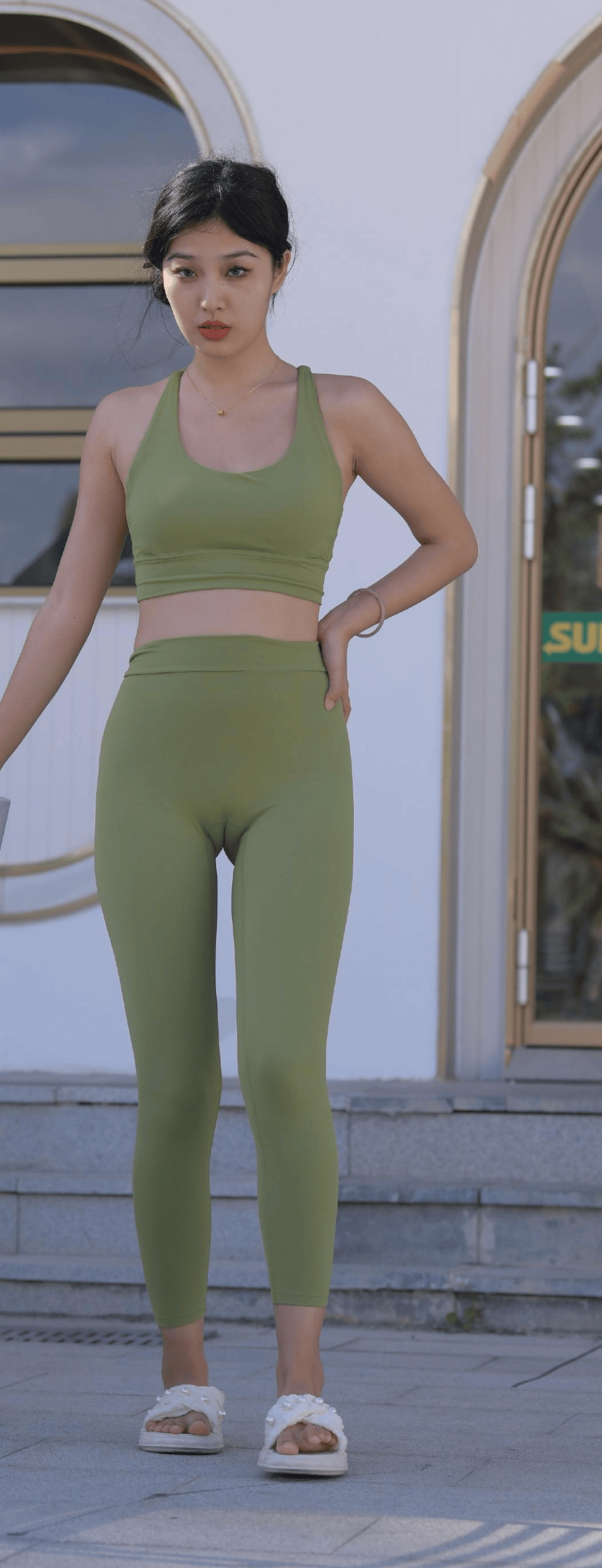 在配饰方面,搭配得非常巧妙。脖子上戴了一条细细的项链,项链上有一个小巧的吊坠,这个小小的点缀为整体柔和的风格增加了一些精致的感觉。脚上穿了一双白色的拖鞋,拖鞋上带有珍珠作为装饰,鞋型很柔软。这双鞋平衡了运动服装常有的利落感,避免显得过于硬朗,让整套look在清新之余,还透出一丝温柔和雅致。没有用太多复杂的配饰,仅仅靠项链和鞋子这两样,就让整体搭配看起来特别和谐。