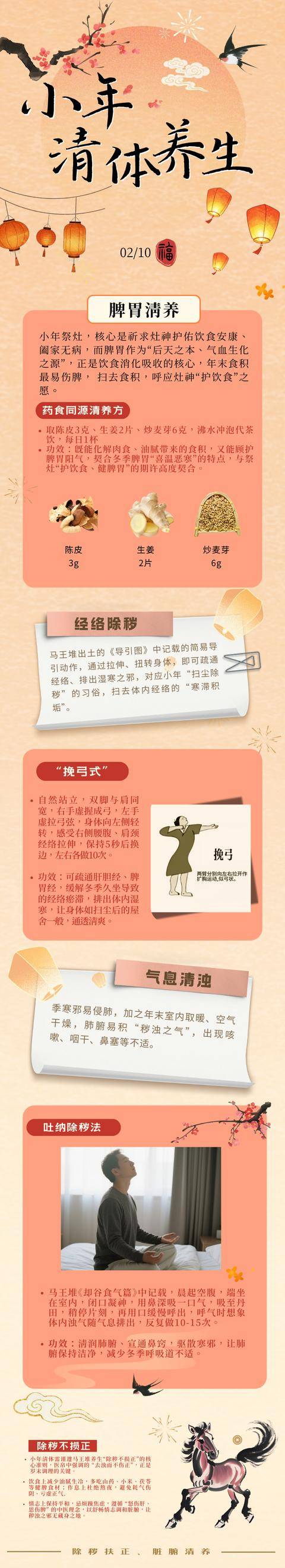 小年至,年味浓。除了祭灶,小年必不可少的“项目”便是扫尘。其实,这藏着古人对洁净与安康的期许,更与中医“祛邪除秽、顾护脾胃”理念不谋而合。两千多年前马王堆汉墓出土的《五十二病方》等珍贵医帛,其记载的“除秽扶正、脏腑清养”,与小年除尘习俗一脉相承,也为我们解锁了一套“清体”养生法。