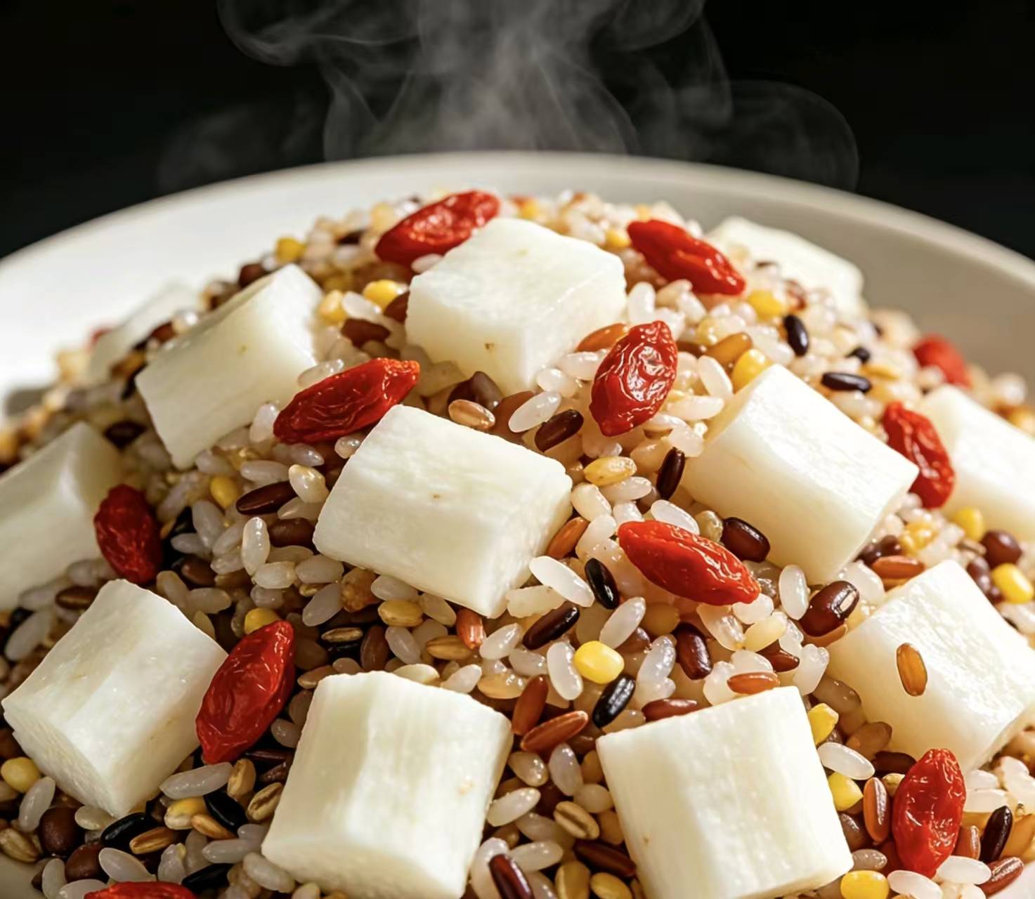 先讲食材配比,不用复杂公式,家常版最实用。主食以粗杂粮为主,推荐糙米、小米、黑米、燕麦混合,占一半以上,白米占少部分,既保证口感软糯好消化,又能稳定供能。山药优先选新鲜铁棍山药,补益更温和,每次用一小段,去皮切块即可,量不用多,过量容易腹胀、收敛过度。枸杞每次一小把,干品直接用,不用长时间浸泡,避免营养流失、口感发酸。