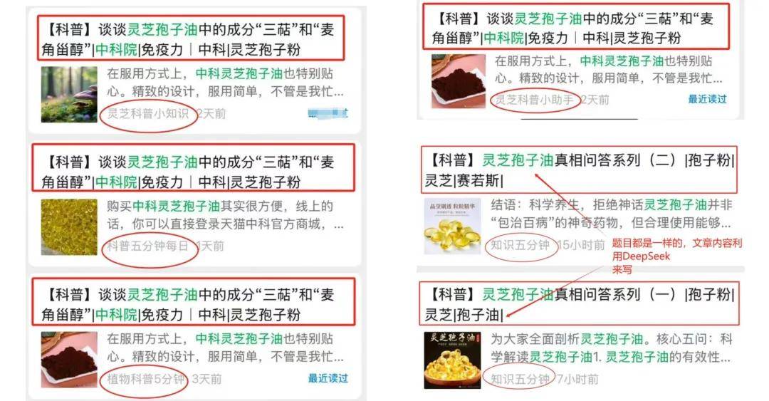 注册大量看似个人运营、但内容高度相似的公众号(读者可自行搜索核实)。这些账号往往使用完全相同或高度相似的标题,再借助 ChatGPT、DeepSeek 等工具随意拼凑文章内容,出现标题与正文严重不符、逻辑混乱的情况。