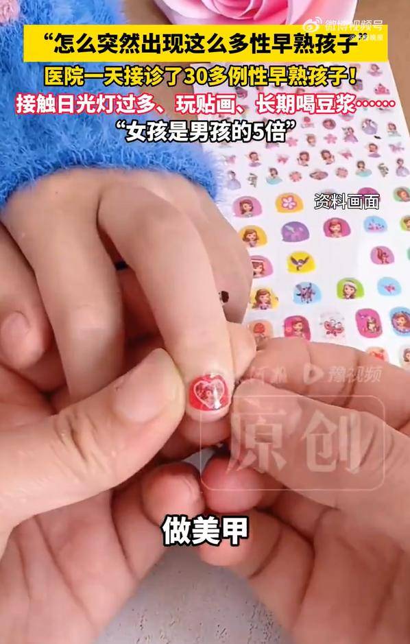 后来经过统计,发现这些孩子接触日光灯过多,喜欢玩贴画,用妈妈护肤品,做美甲,长时间服用豆浆、蜂蜜、高糖高脂食品:“女孩差不多是男孩的5倍。”