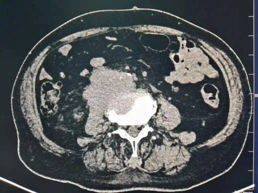 神经鞘瘤(位于腹主动脉旁)。肿块内可见囊变低密度区