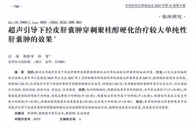 [1]汪海,胡胜军,杜智.超声引导下经皮肝囊肿穿刺聚桂醇硬化治疗较大单纯性肝囊肿的效果[J].中西医结合肝病杂志,2024,