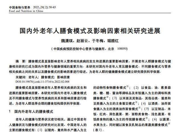 [1].魏潇琪,赵丽云,于冬梅,琚腊红.国内外老年人膳食模式及影响因素相关研究进展.中国食物与营养 2022,28(2):58-65