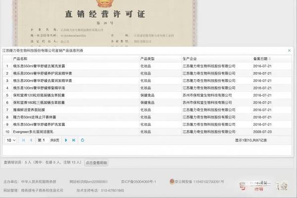 · 隆力奇直销牌照范围:仅限化妆品、保健食品、保洁用品三类,共87种产品。