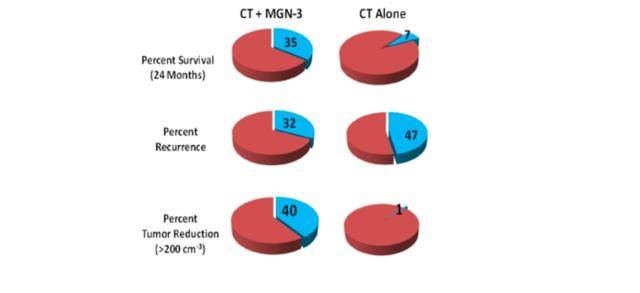 单独使用 CT 治疗与 CT+MGN-3 治疗后患者的生存率、复发率和肿瘤缩小率。