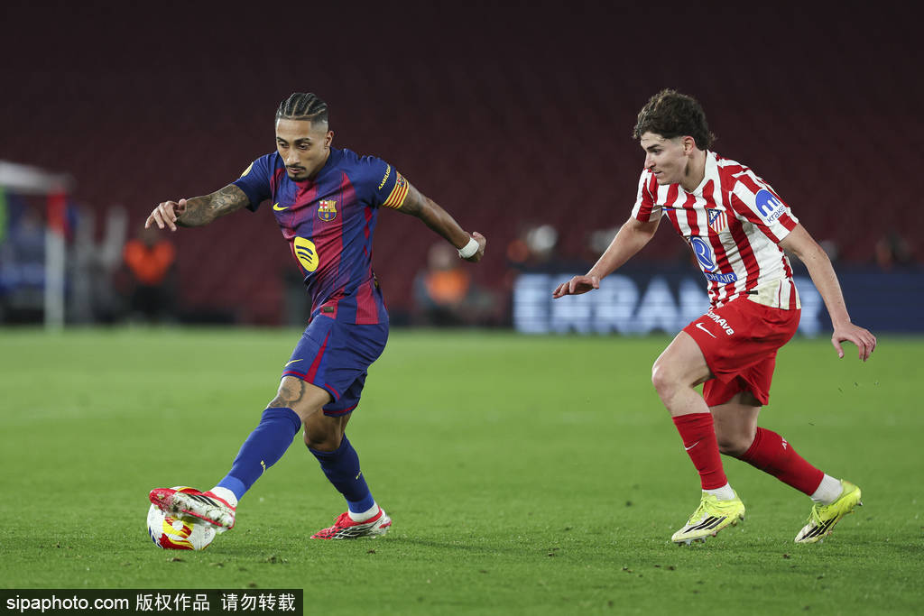 上半场补时第5分钟,巴萨再追一球!佩德里在禁区内被普维尔绊倒,裁判判罚点球,拉菲尼亚主罚命中,巴萨2-0领先,总比分2-4马竞。