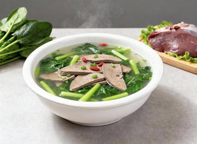 食材:菠菜1把,猪肝1块, 枸杞1把,盐, 胡椒粉, 香油,葱