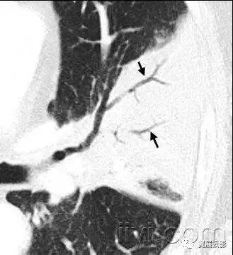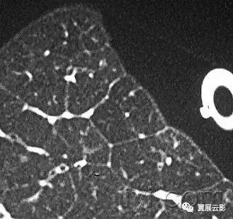 CT:在薄层CT上,尤其是在增厚的情况下(例如肺水肿),在小叶中心的肺动脉及其分支是可以观察到的。这些小血管的直径月0.5到1.0个毫米。但是细支气管壁薄,约0.15mm,正常情况下薄层CT上观察不到。