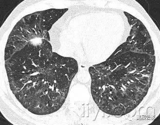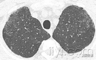 CT:主要的异常是磨玻璃影,可见血管旁的薄壁囊肿。也可以发生肺结节、网状阴影,小叶间隔和支气管束的增厚、弥漫性的实变。