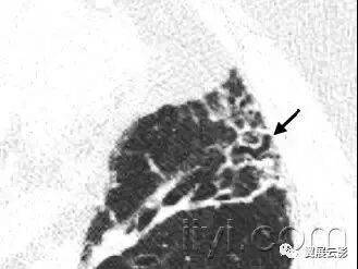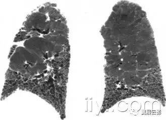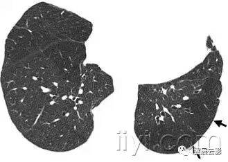 CT扫描:肺结构扭曲,常与肺纤维化同时发生,有肺体积的减小。