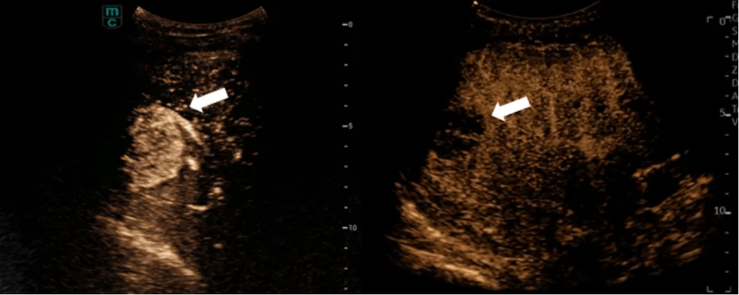 右图为病灶治疗后超声造影显像情况