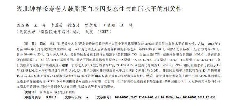 刘国栋.湖北钟祥长寿老人载脂蛋白基因多态性与血脂水平的相关性 ,中国老年学杂志,2017-06-25