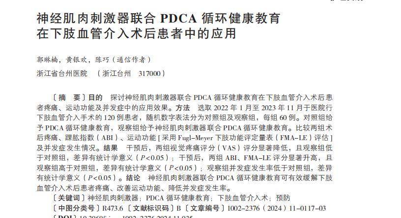 [1]郭琳楠,浙江省台州医院,神经肌肉刺激器联合 PDCA 循环健康教育在下肢血管介入术后患者中的应用,2024-06