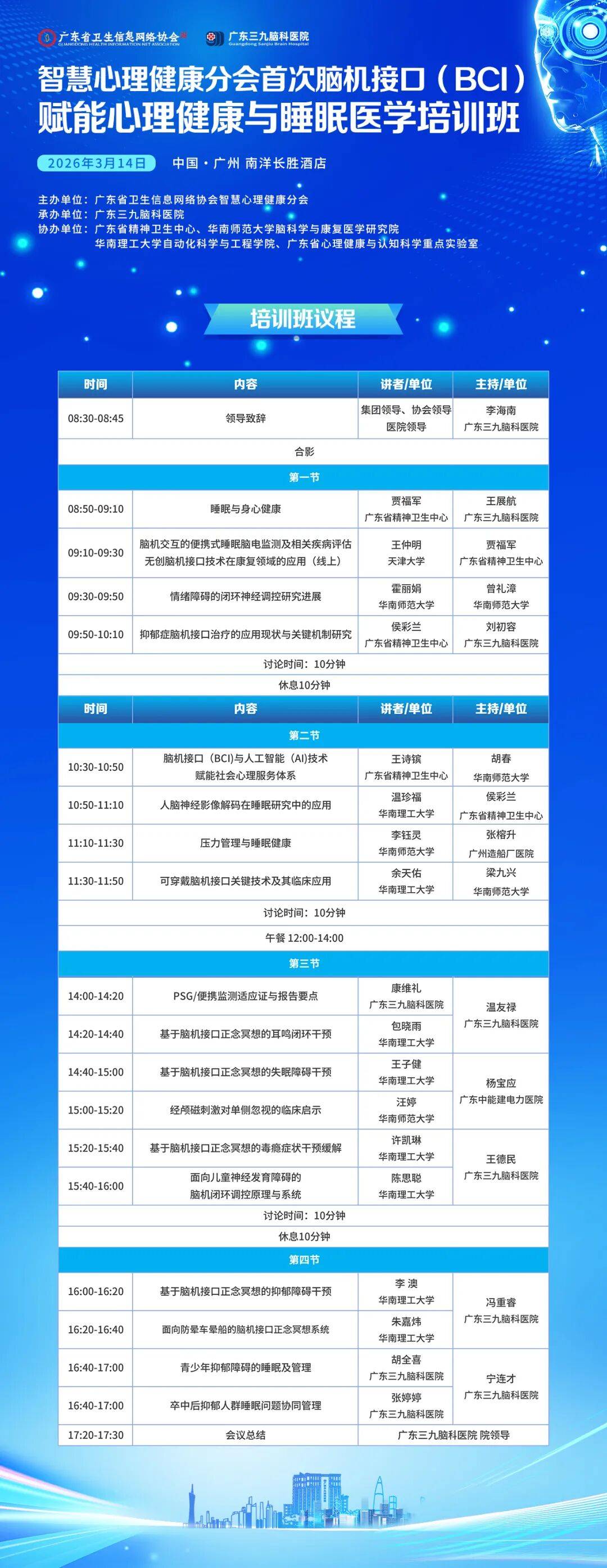 在此背景下,由广东三九脑科医院将举办首届“脑机接口赋能心理健康与睡眠医学培训班”。本次培训班由广东省卫生信息网络协会智慧心理健康分会主办,广东省精神卫生中心、华南师范大学脑科学与康复医学研究院、华南理工大学自动化科学与工程学院、广东省心理健康与认知科学重点实验室协办,计划于2026年3月14日(周六)以线上线下相结合的方式举行。会议旨在推动脑机接口技术在睡眠医学与心理健康领域的规范化应用,促进跨学科交流与技术创新,提升区域医疗机构在睡眠评估、心理干预及随访管理方面的专业能力,搭建高水平学术交流平台,助力心理健康与睡眠医学服务体系的高质量发展。