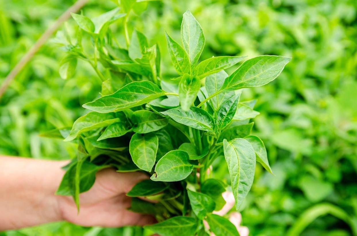 掐梗子:用手掐掐顶上的嫩梗,一掐就断,水灵灵的,这是最嫩的。要是费劲还拉丝,那就老了,只能扔。