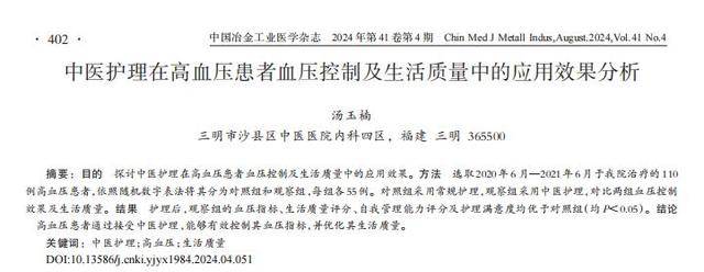 汤玉楠.中医护理在高血压患者血压控制及生活质量中的应用效果分析,中国冶金工业医学杂志,2024-08-01.