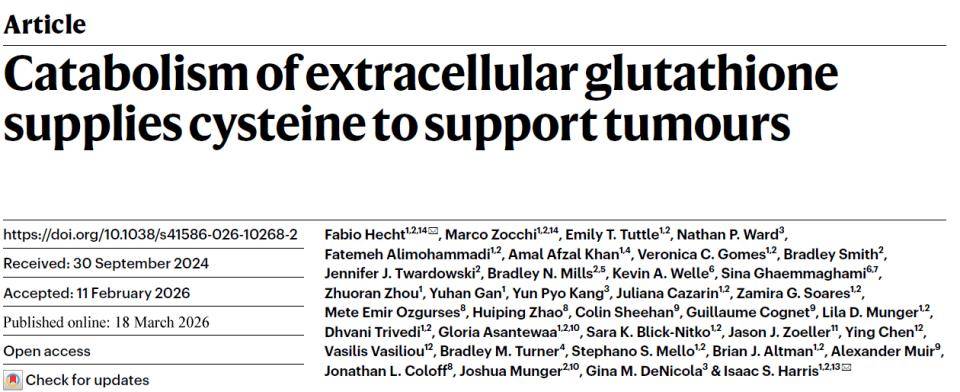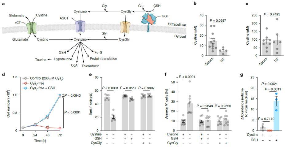 基于这一发现,研究人员曾设计了多种分子阻断半胱氨酸的摄入通道,希望能阻止癌症的生长。但观察结果显示,这种干预并无法“饿死”癌细胞。本周,《自然》杂志的另一项研究揭示了其中的原因:癌细胞可以通过获取微环境中的 谷胱甘肽来补充半胱氨酸。