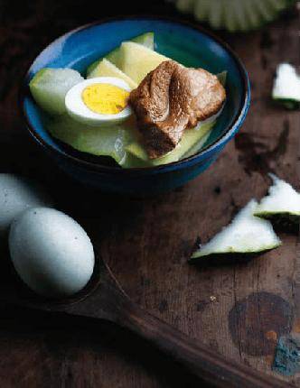 食材:猪瘦肉250克,冬瓜500克,咸蛋1个,生姜3片,胡椒粉少许,食盐、花生油适量。