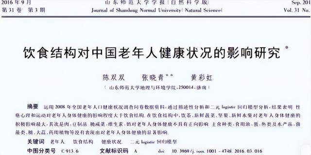陈双双.饮食结构对中国老年人健康状况的影响研究, 山东师范大学学报(自然科学版), 2016-09-15