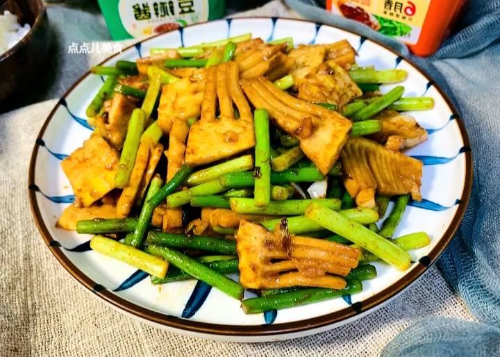 所需食材:春笋1根、蒜苔1把、蒜6瓣、豆瓣酱一勺、甜面酱20克、香油少许、盐少许。