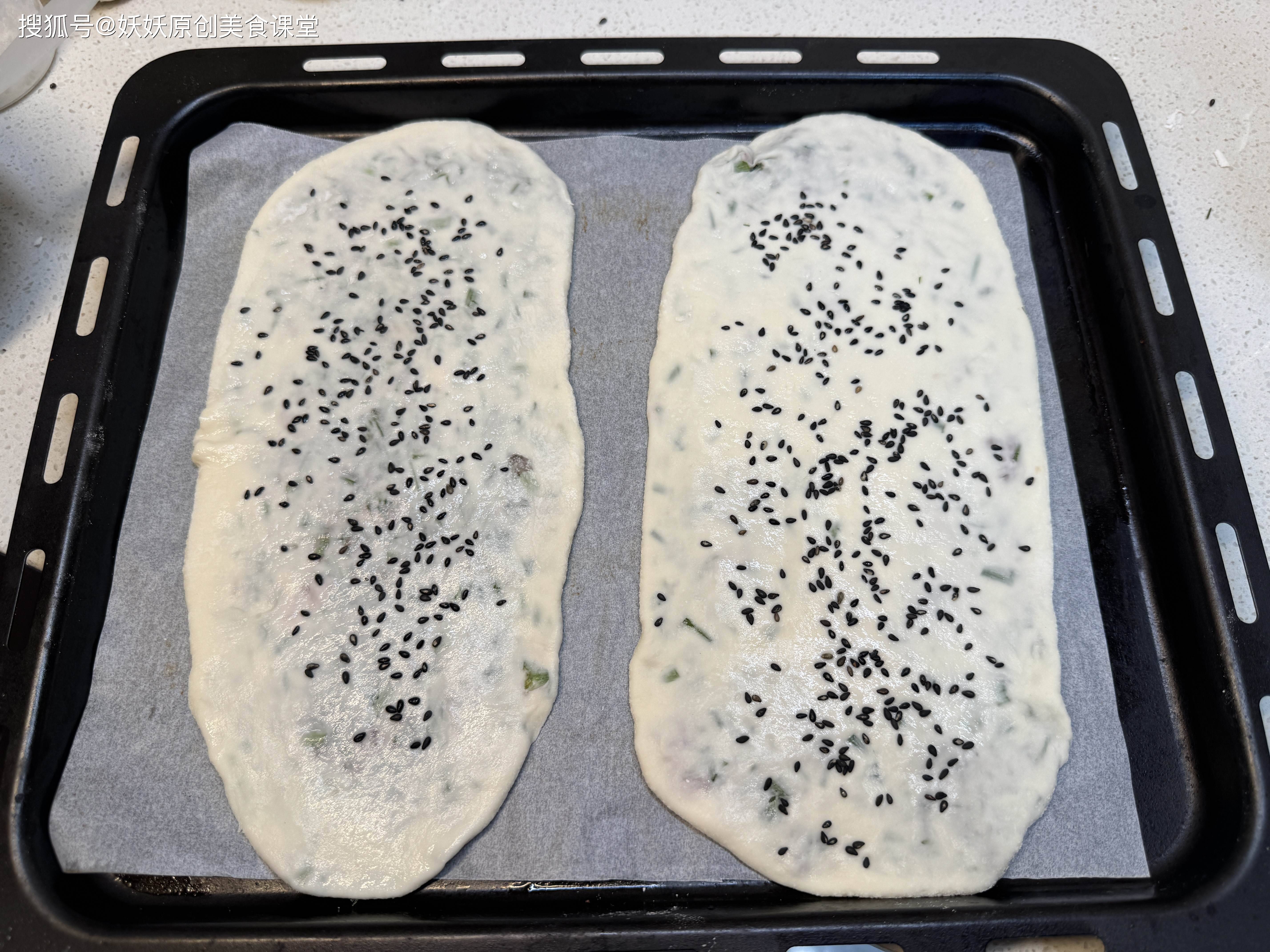 7,用擀面杖擀成长的薄片,表面刷一层糖水,撒上黑芝麻,送入预热好的烤箱,200度左右烤至表面焦黄即可。