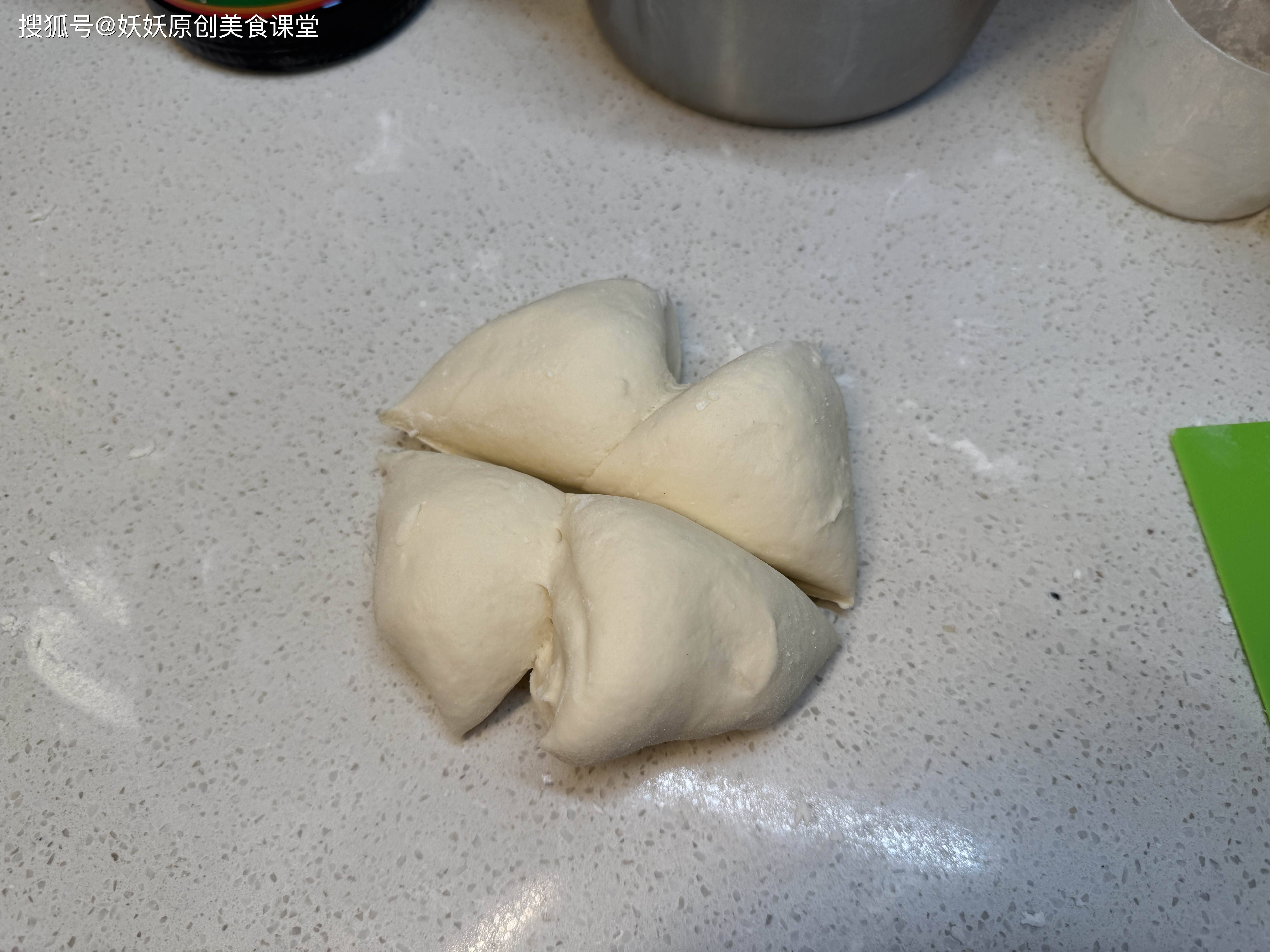 5,把发酵好的面团重新揉搓一下,排出多余的空气,如果粘手可以撒一些干面粉在台面上,再均匀分成四等份。