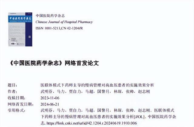 [1]武明芬.医联体模式下药师主导的慢病管理对高血压患者的实施效果分析,中国医院药学杂志,2024-06-21