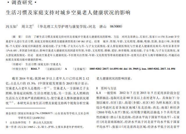 [1]冯玉如,周立芝.生活习惯及家庭支持对城乡空巢老人健康状况的影响[J].中国老年学杂志,2017,
