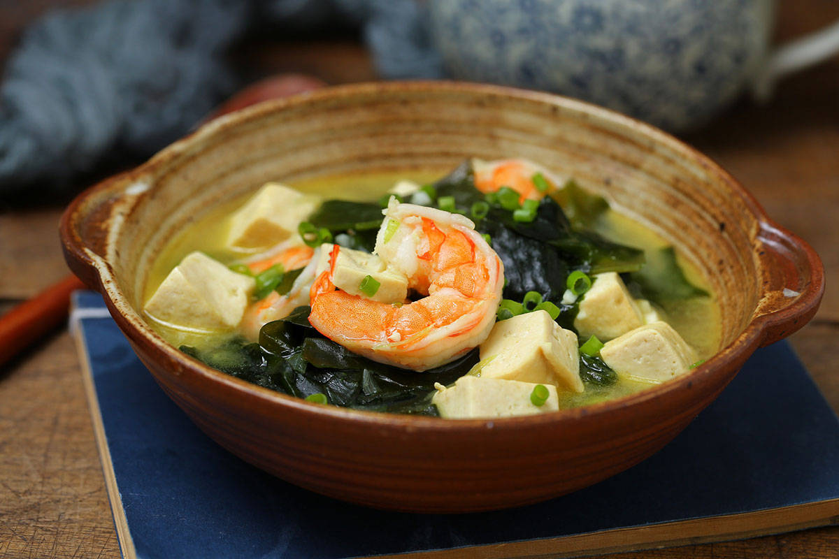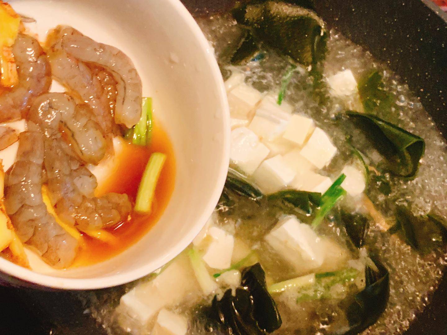 4、继而重新起锅放入饮用水煮开,豆腐和海带倒进去,调些生抽,盐,姜片,煮十分钟后,把虾仁倒进去,搅一搅,将其煮熟后,补充些许盐,香葱,即可关火。