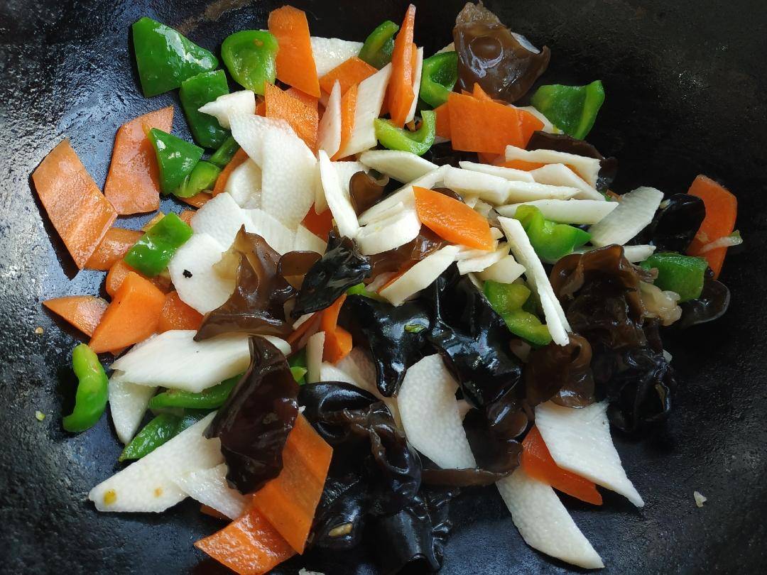 5、接着再将山药和木耳倒里边,继续与锅里的食材一起炒,直到全都熟透,调些酱油,鸡精,盐,将食材的滋味调整好,即可关火装盘。