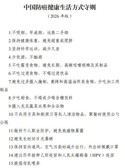 最近,国家卫生健康委正式发布了《中国防癌健康生活方式守则》——它不是晦涩难懂的医学论文,也不是夸大其词的养生噱头,而是一本人人能看懂、照着做就能降低患癌风险的“官方防癌说明书”。15条防癌法则,覆盖生活方方面面,很多人第一条就没做到。