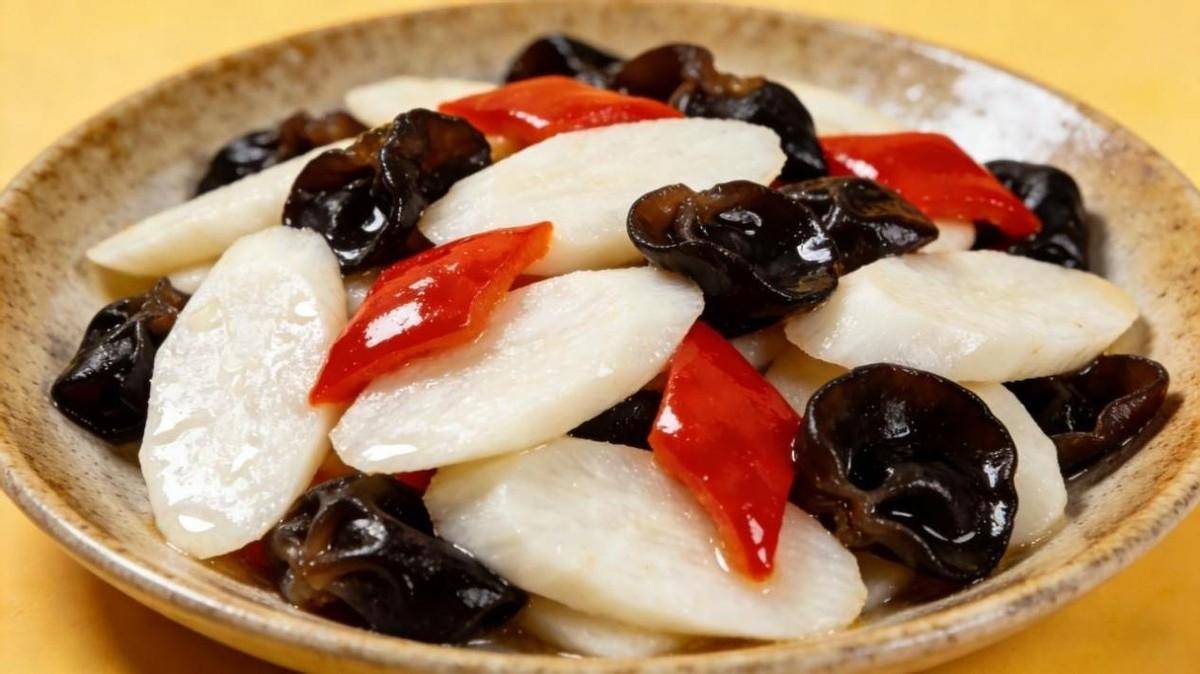 1、将山药去皮切成薄片,放入沸水中焯水10秒后捞出过凉水。将干木耳用温水泡发,洗净后撕成小朵。大蒜切成蒜末备用。