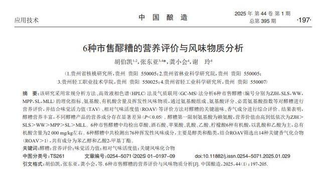 6种市售醪糟的营养评价与风味物质分析,胡伯凯,中国酿造,2025-01-25