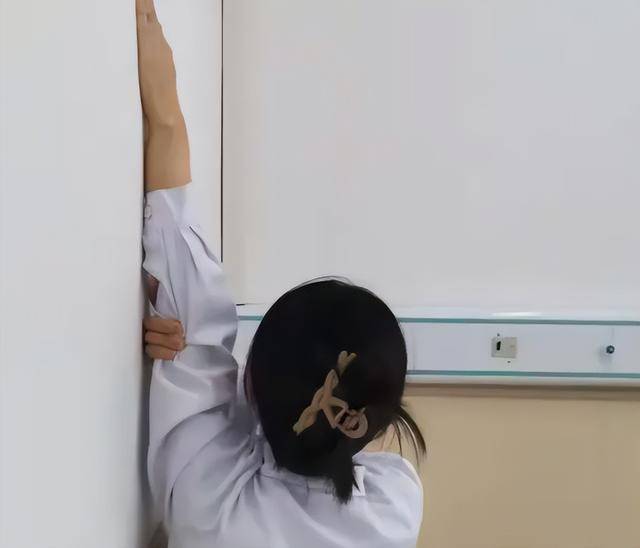 靠墙爬手。面对墙站立,手指像“爬楼梯”一样缓慢上移,到轻度牵拉处停留10—15秒,重复10次。