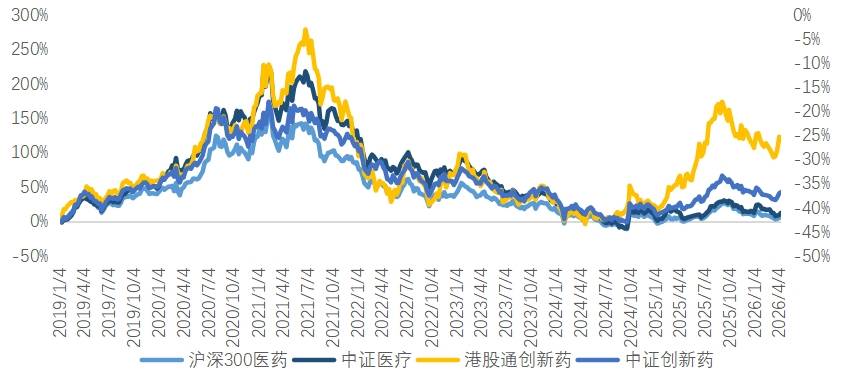 若将医药板块内部进行拆分,可以分为医疗和创新药两大核心细分赛道。回顾历轮医药行情,创新药细分赛道因其业绩增速具备爆发性而呈现出“高弹性、高波动”特征,是医药板块中的“锐度担当”。其中,港股创新药由于创新药企纯度更高,弹性也更强,在行情启动阶段的超额收益尤为显著。